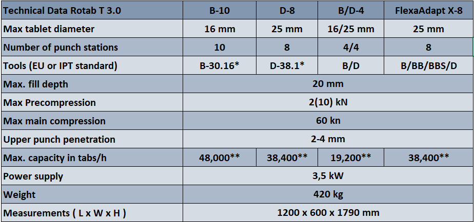 The drive motor with its 3.0 KW is ideal, thanks to the high pressing force and low turret speeds. The separately adjustable pre-compression station, the optional FlexAdapt rotor with its pitch circle of 130 mm for all punch formats from EU B to EU 1″- 441 and the flexible filling funnel sizes with dock-on solutions for all standard charging methods make the RoTab® T 3.0 very interesting for tablet development. No complicating changing of the rotor is necessary. The transparent filling tube made of Schott®glass facilitates product flow observation.